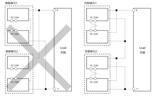 相比之下,將已經(jīng)并聯(lián)連接的TDK-Lambda電源單元進行串聯(lián)是可行的。因為并聯(lián)連接的電源單元電壓相同,將它們串聯(lián)起來不會引發(fā)上述問題。但即便如此,也需要注意以下幾點: