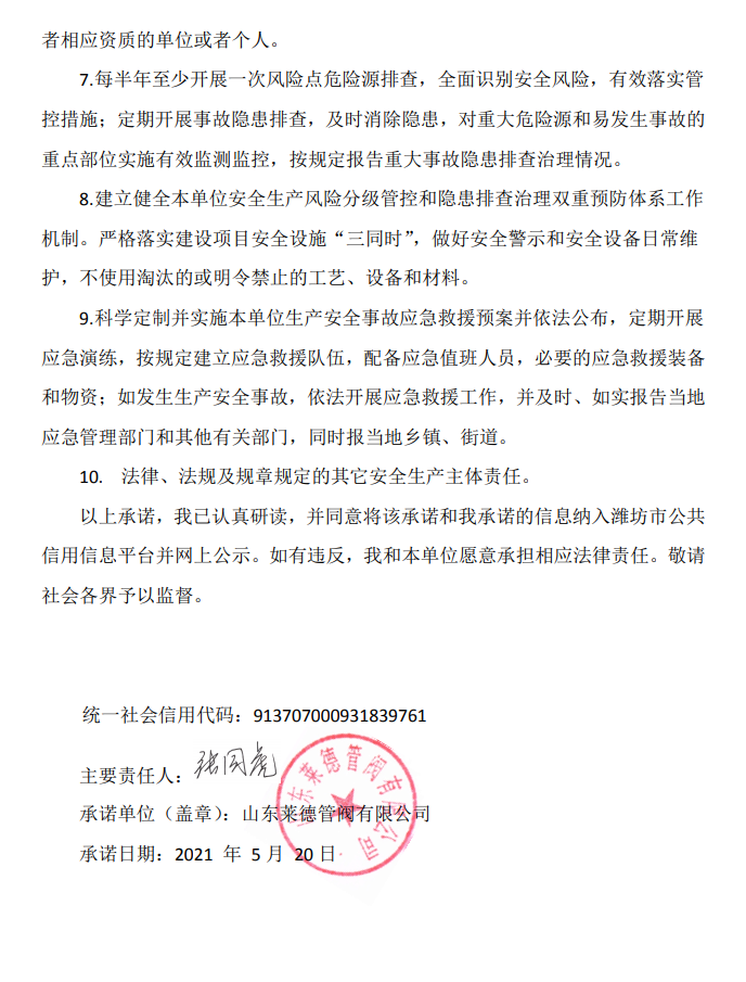 萊德管閥作出安全生產信用承諾